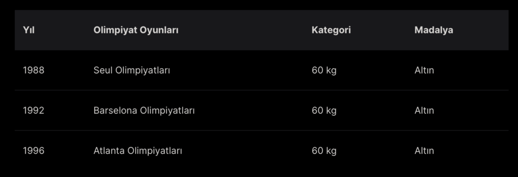 Süleymanoğlu, üç farklı Olimpiyat Oyunları’nda toplam üç altın madalya kazanmıştır. İlk olarak 1988 Seul Olimpiyatları’nda 60 kg kategorisinde altın madalya kazanmıştır. 1992 Barselona Olimpiyatları’nda ve 1996 Atlanta Olimpiyatları’nda da aynı kategoride altın madalya alarak önemli bir başarı elde etmiştir.